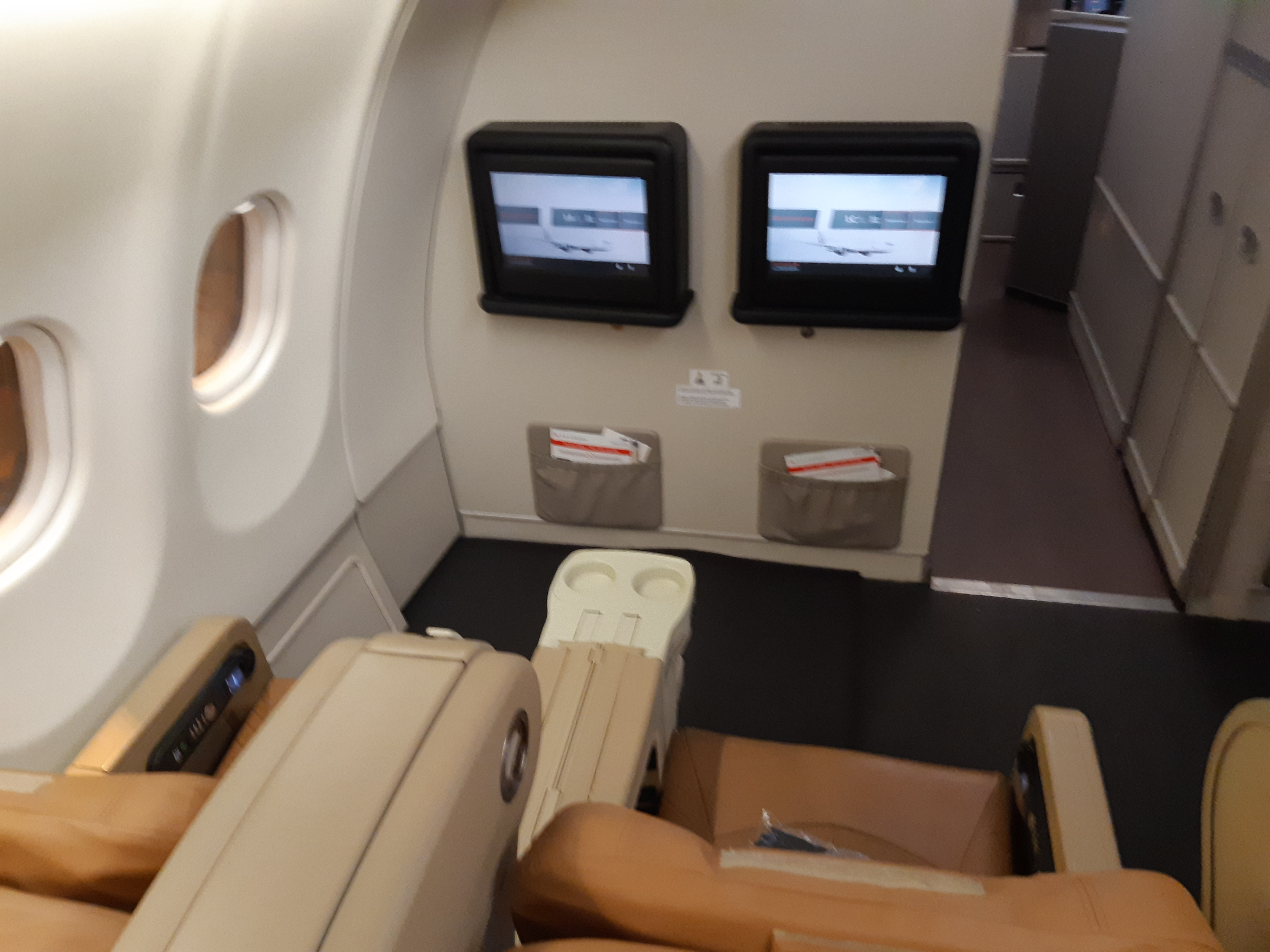 This Airbus had PE and Economy only between YUL and DUB, it was acquired from another airline with the older Business Class lie flat seats left in PE, that will be changed by Nov 2019 to the regular PE seats like Boeing 737 Max 8 has, the outbound flight was a great value and quite comfortable, inbound seat 2A had no working audio or TV as remote control was ripped out of the armrest, 2 C had dead seat controls. Note that Staff were attentive and food was excellent. Airbus has a quiet interior. New configuration in PE will be similar to Boeing 737 Max 8 and 787-8.