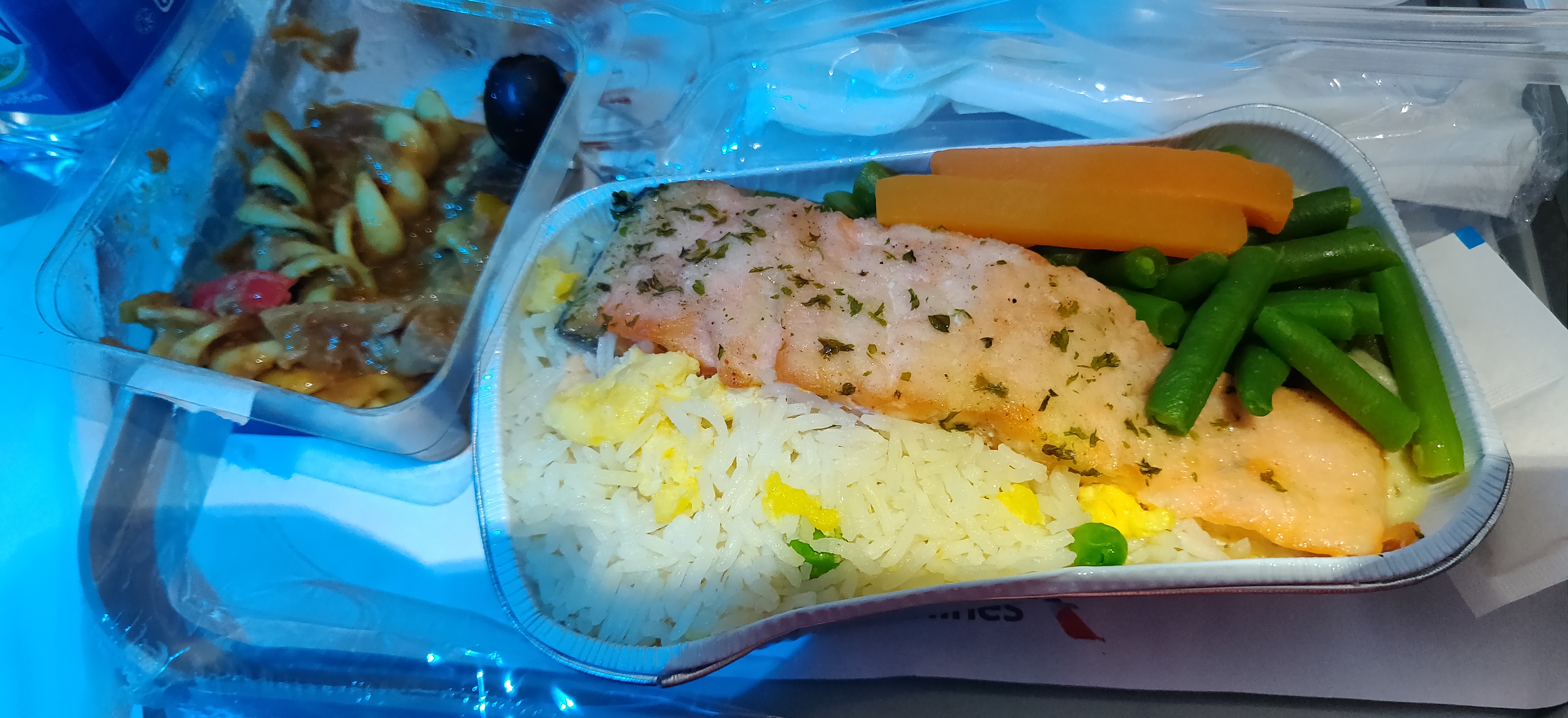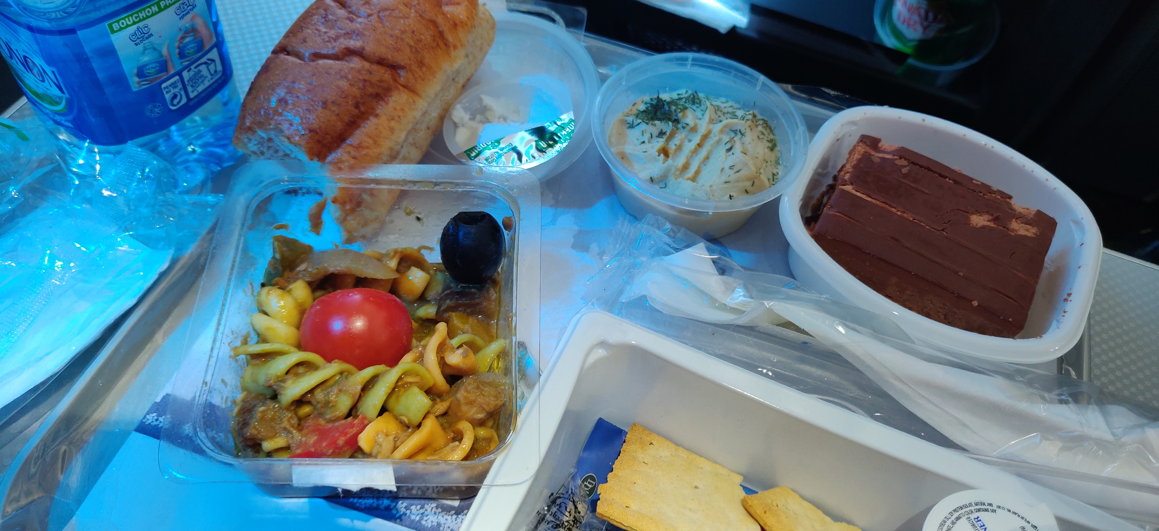 Maybe it's my imagination, but it feels like this seat has just a few extra inches of leg room (foot space) when fully flat. The two windows are well-placed. On the other hand, the light from the galley was annoying, as was the noise - and they set up the snacks on the ledge in front of 1H so it was a busy spot (especially since people from coach were coming up for snacks as well). So it was comfortable enough, and the attendants were all great, but the noise, light and traffic left this seat a little less than desirable. Also, I'm not sure who catered this flight, but we weren't impressed with the food options. The "light meal" before landing was actually better than the departure meal. There were just a few types of snacks, and while they did include some plastic-wrapped, slider-type fresh sandwiches, those went fast and weren't replenished. There were maybe four or five packaged items (chips, popcorn) and when those were occasionally refreshed it was the same old stuff. You don't fly for the food, of course, but it was disappointing.