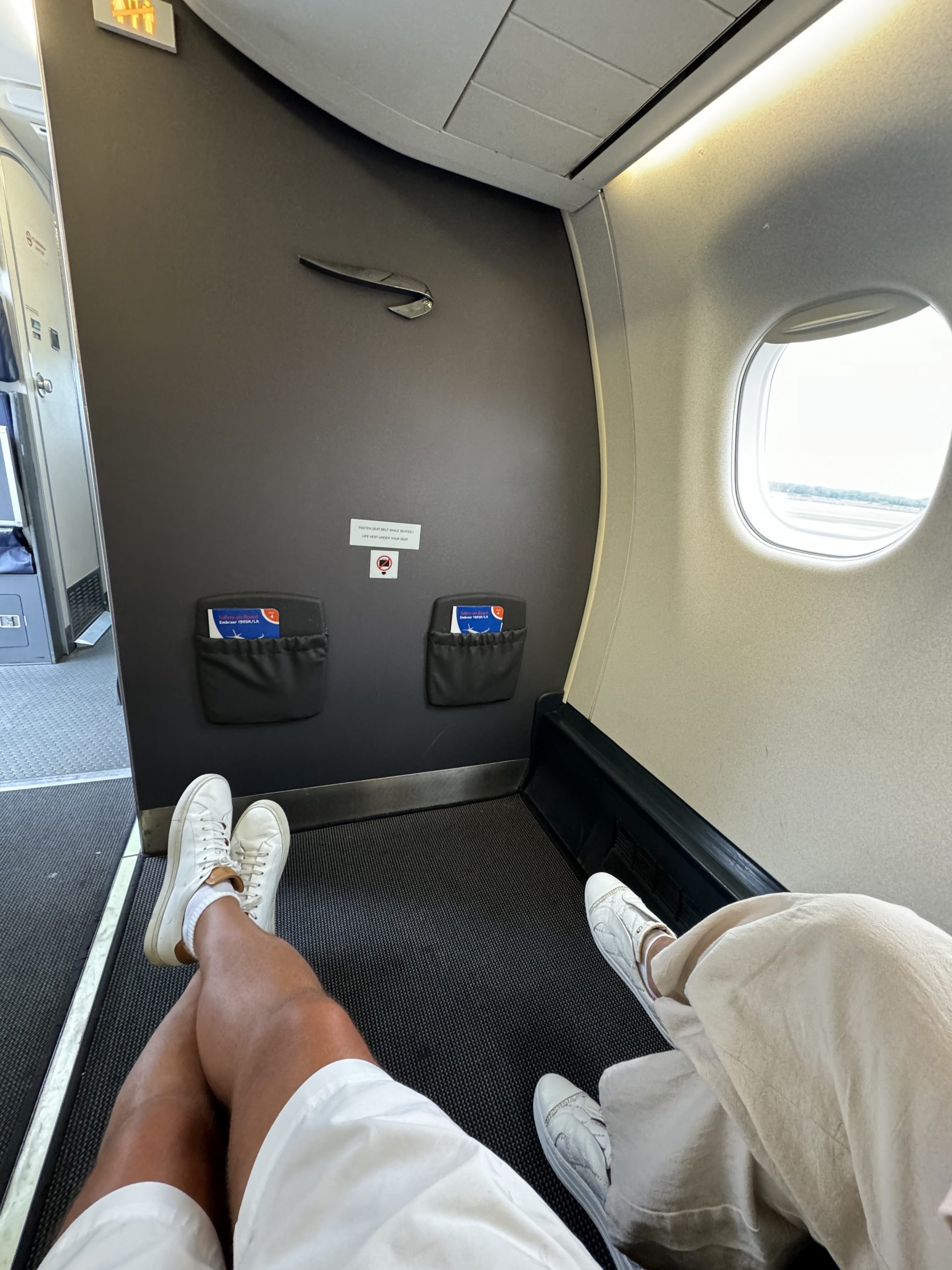 The Embraer 190 isn’t the best plane (the WC is seriously tiny) but seat 2C/D are exceptional as they oddly have a massive amount of legroom in front of them. I couldn’t touch the wall.