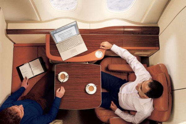 Whether discussing business, or sharing a relaxing moment, the Singapore Airlines Suite is exceptionally accommodating, with a soft leather chaise lounge across from the armchair and a large dining table. Everything required to do business, or enjoy KrisWorld is easily accessible, including a multi-port with power supply, headphone connection, USB ports and more. |